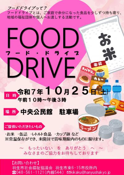 午前10時~午後3時 会 場:中央公民館 駐車場 フードドライブとは、ご家庭で食べきれない食品を少しずつ持ち寄り、 必要とされる方や、福祉団体等へお渡しする活動です。 皆様の善意で多くの方が救われます。 ご提供いただきたいもの:お米、カップ麺、缶詰、レトルト食品、 パックご飯(全て賞味期限表記のあるものに限る) ![]() |