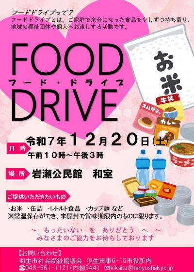 午前10時~午後3時 会 場:岩瀬公民館 和室 フードドライブとは、ご家庭で食べきれない食品を少しずつ持ち寄り、 必要とされる方や、福祉団体等へお渡しする活動です。 皆様の善意で多くの方が救われます。 ご提供いただきたいもの:お米、カップ麺、缶詰、レトルト食品、 パックご飯(全て賞味期限表記のあるものに限る)