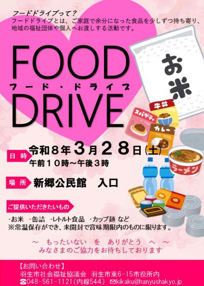 午前10時~午後3時 会 場:新郷公民館 入口 フードドライブとは、ご家庭で食べきれない食品を少しずつ持ち寄り、 必要とされる方や、福祉団体等へお渡しする活動です。 皆様の善意で多くの方が救われます。 ご提供いただきたいもの:お米、カップ麺、缶詰、レトルト食品、 パックご飯(全て賞味期限表記のあるものに限る)