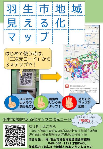 でも、どこにあるのか分かりにくい、行き方が分からない、という声もありました。 そこで、「はにゅう地域ふれあいだいじゅかい」の皆さんのご協力をいただき、地図にまとめて「見える化」することで、誰でも簡単に探せるように「羽生市地域見える化マップ」を作成しました。 使い方 ・スマートフォン:二次元コードをカメラで読み込んでください。 ・パソコン:こちらをクリックするか、以下のアドレスをブラウザに入力してください。 https://www.google.com/maps/d/edit?mid=1s6PombUV12Aes_u6qe4EMd-aEcDVGH8&usp=sharing マップで見られる内容 ・居場所(生活支援活動拠点) → 地域の住民が集まり、ちょっとした困りごとを相談・共有できる場所 ・いきいき百歳体操の会場 → 健康づくりの場【羽生市公式ホームページ:いきいき百歳体操】 ・移動スーパー → R8/2/5から再開、買物を楽しみつつ住民が集まれる場所 ・日常生活圏域 ◎地域包括支援センター → 介護や生活の相談窓口【羽生市公式ホームページ:地域包括支援センター】 ◎居宅介護支援事業所 → ケアマネジャーがいる事業所 ・あい・あいバスの停留所 → 移動の足となる場所【羽生市公式ホームページ:あい・あいバス】 皆様のご意見をお聞かせください 「羽生市地域見える化マップ」は今後も更新していきます。 「掲載されていないけど、集まりの場所があるよ」「こんな情報を追加してもらえると便利じゃないかな」など、みなさんのご意見をお待ちしております。